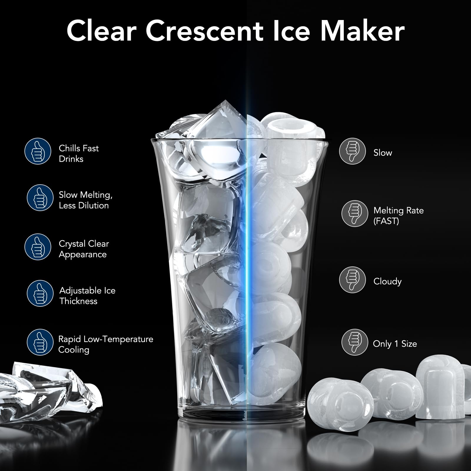 - Crescent ice which not only looks sophisticated but also enhances the visual appeal of your drinks. Crescent ice also has a larger surface area compared to traditional cubes, which allows for faster and more efficient cooling. Your drinks stay chilled longer without becoming overly diluted.