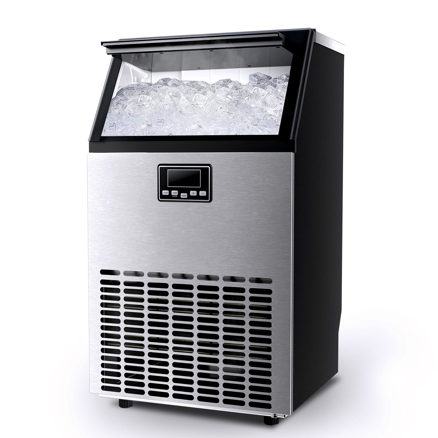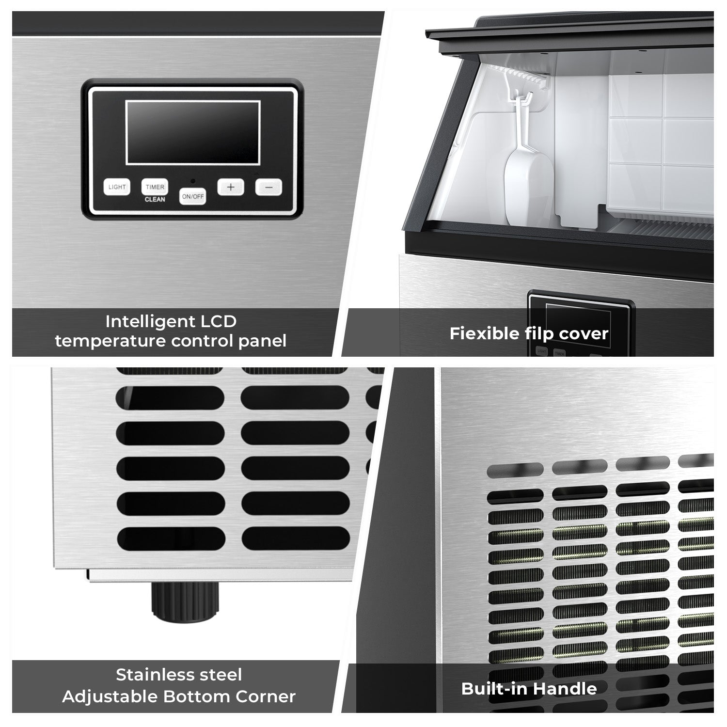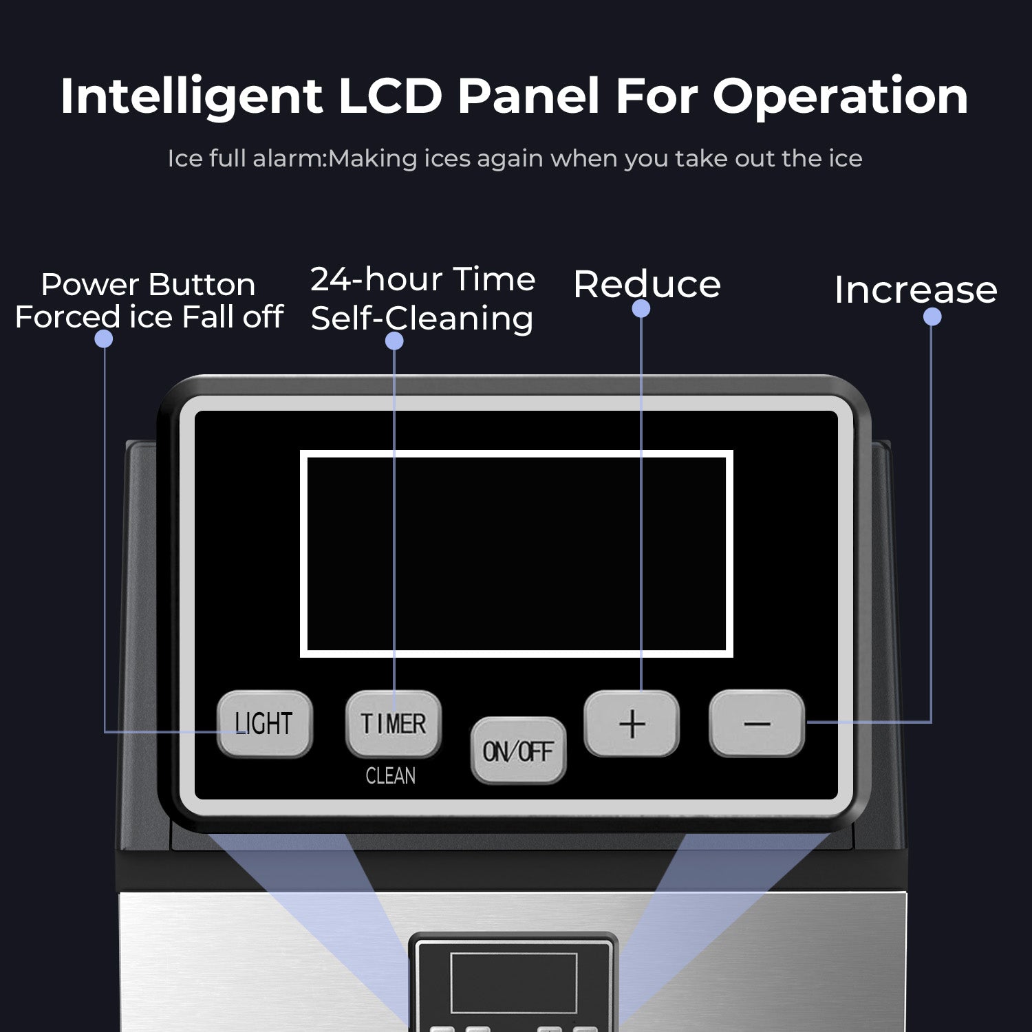 Smart LCD Control Panel:The commercial ice machine's LED panel enables various functions, including ice thickness adjustment, a 24-hour timer, and a self-cleaning feature. You can adjust the timer to produce thin, medium, or thick ice cubes to suit different drinks or uses