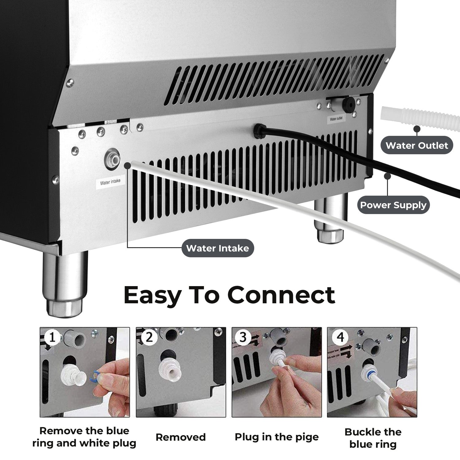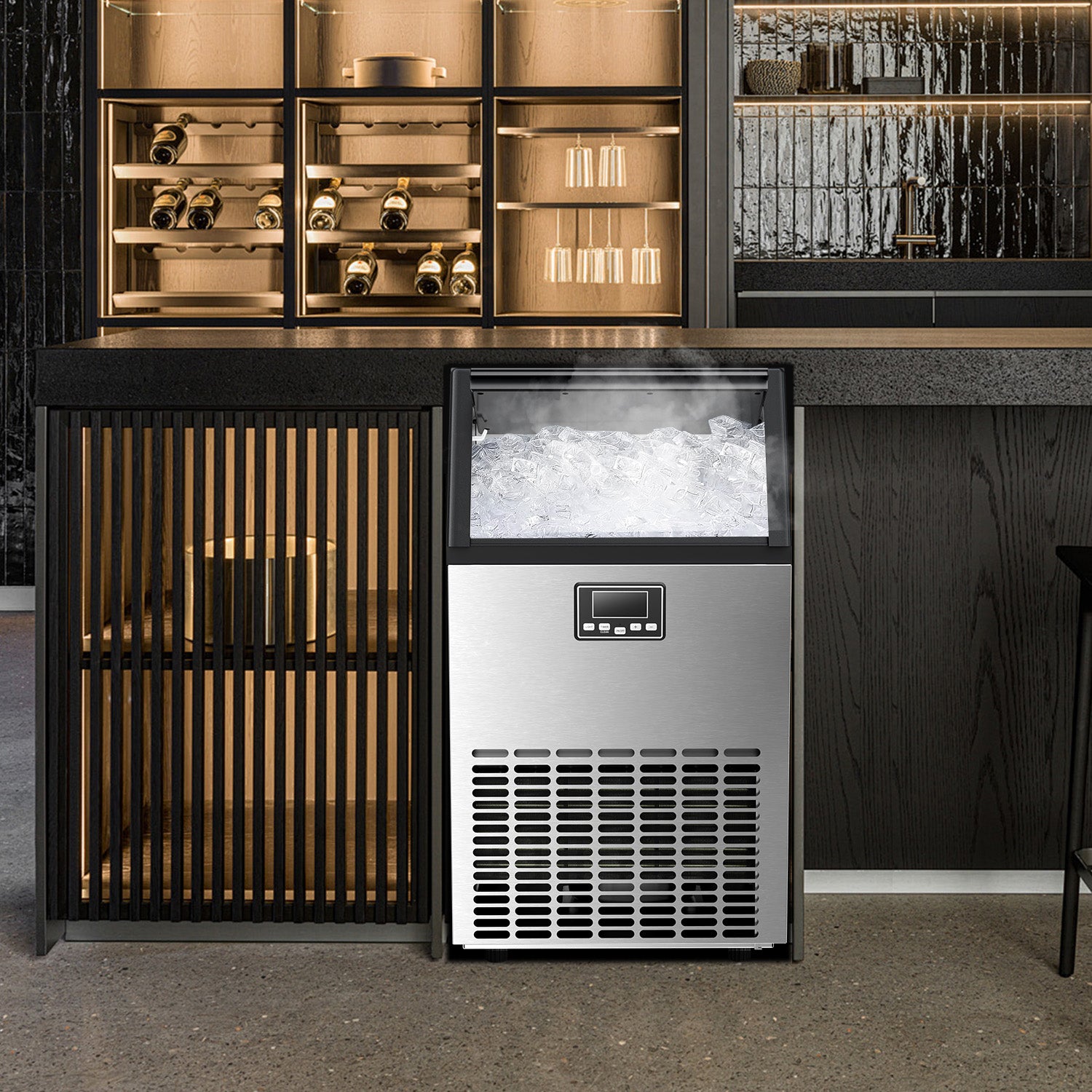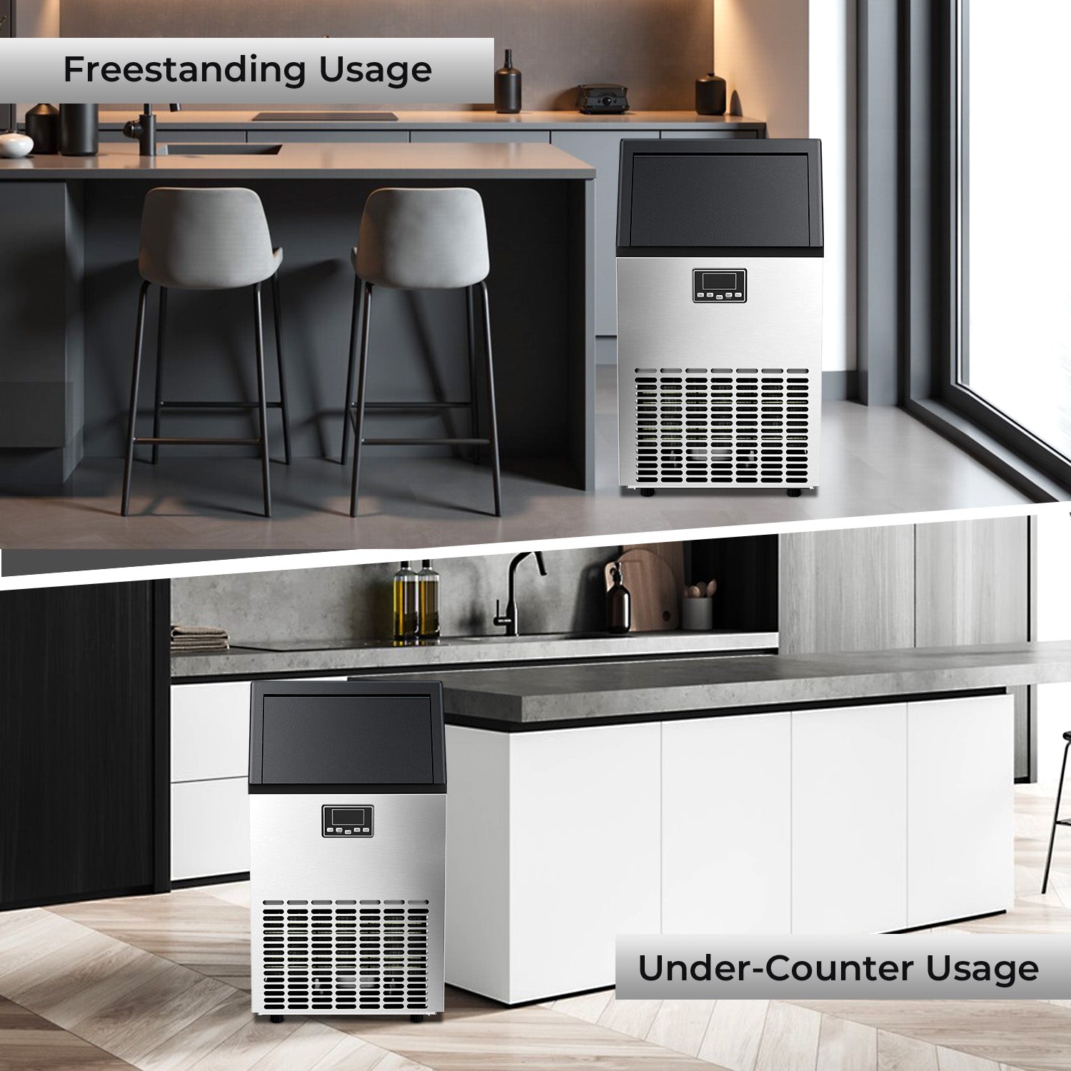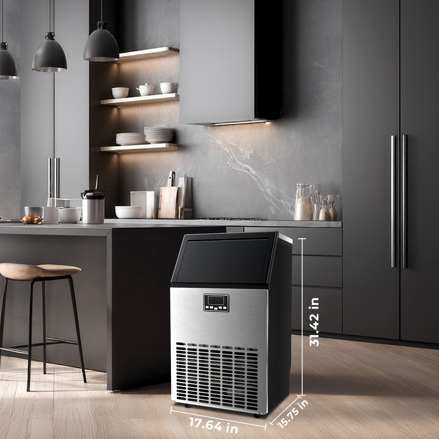 Sturdy and Durable Material: Made of durable stainless steel, the ice maker has a smooth and sanitary surface. the stainless steel surface greatly improves its durability, sturdiness, and service life. The under-counter ice machine maker measures 17.64 x 15.75 x 31.42 inches and can be installed as a free-standing unit