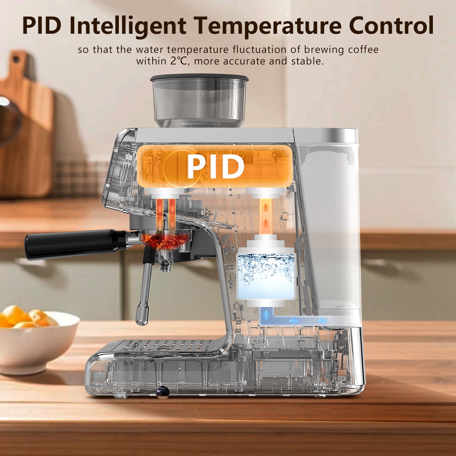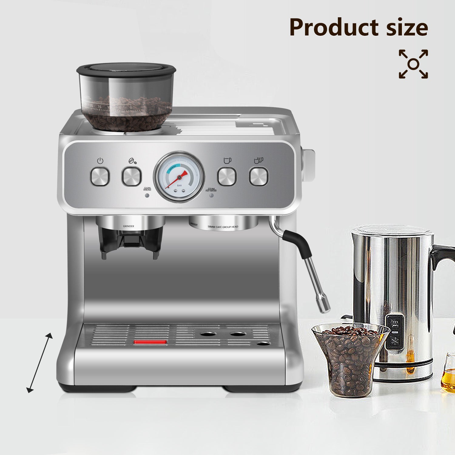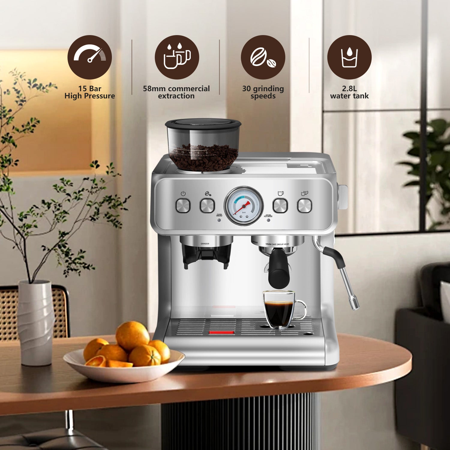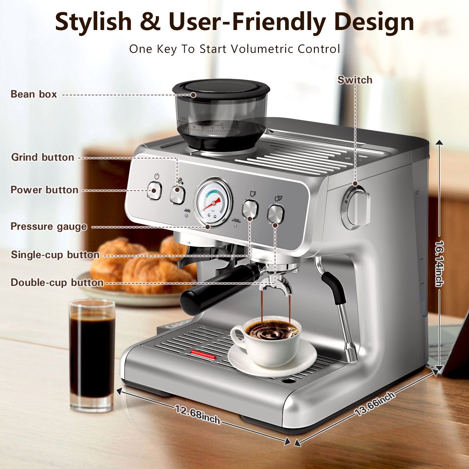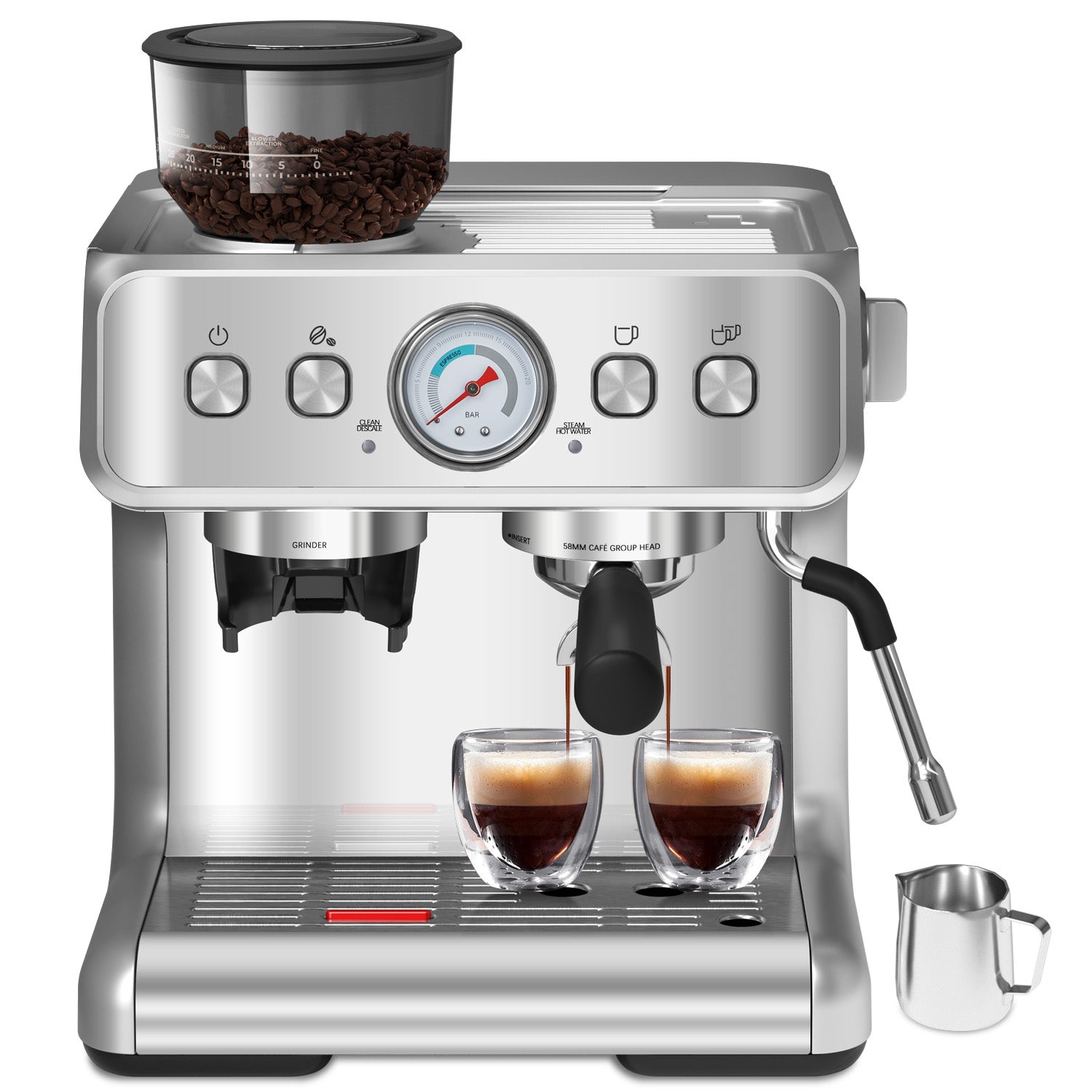 15 Bar Espresso Machine with Built-In Grinder Steam Wand Pre-Infusion 75oz Tank