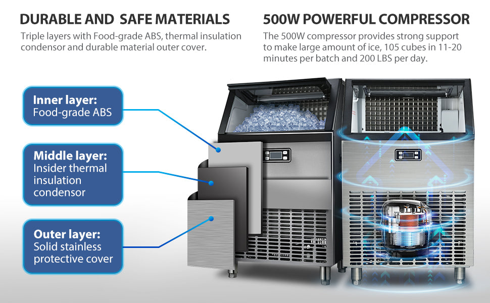 • Compact & Durable - The stainless steel commercial ice maker is also in compact design but available to store a large capacity of ice cubes.