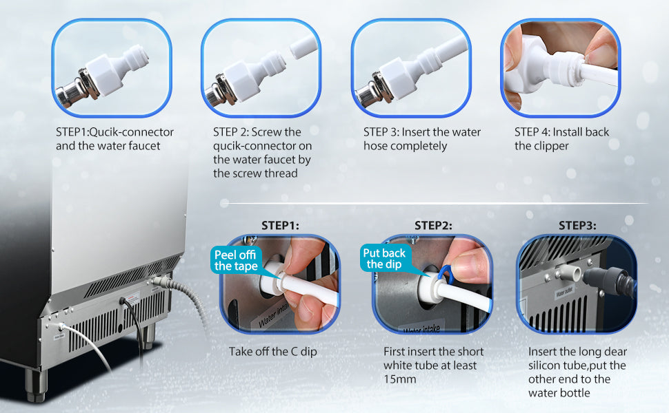 A. Water inlet port for water supply: Use to connect the water supply pipe (recommend to connect with tap water but we still provide water pipe for bottled water use).
